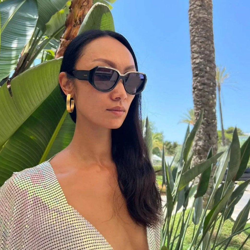 Stylish vintage shape sunglasses with a mirror edge on top to make you shine like a star. Polish acetate black frame with black lenses and thick temples. All our sunglasses are made of quality materials and UV 400 protection. Cool shades for fabulous people.